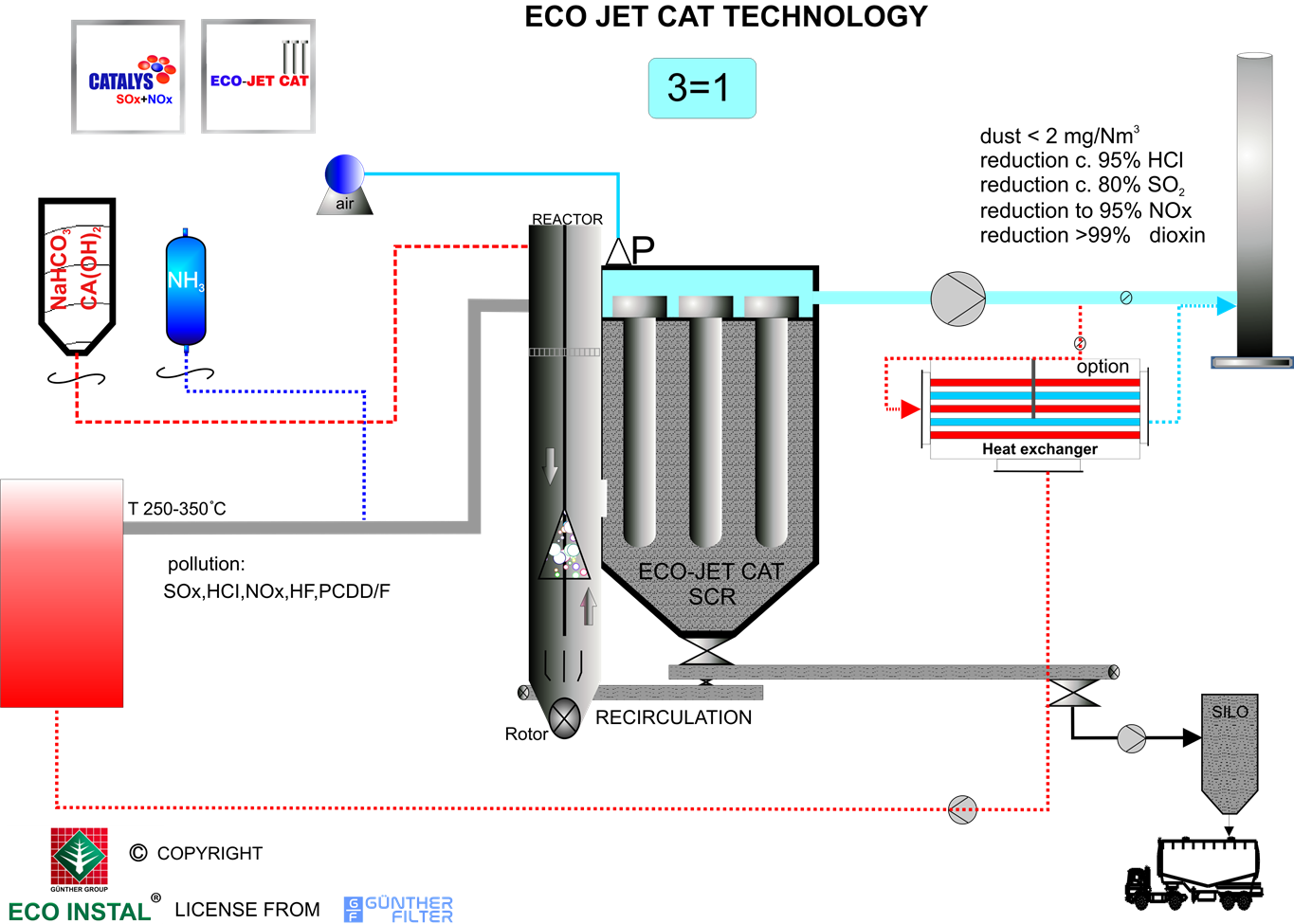 Wkład ceramiczny ECO-JET CAT – SCR, pokryty powłoką katalityczną, zapewnia skuteczną redukcję SOx, NOx, HCl, HF oraz PCDD/F. Dzięki zastosowaniu wtrysków sorbentów, system ten spełnia najsurowsze normy emisyjne, przyczyniając się do ochrony środowiska i zdrowia publicznego.