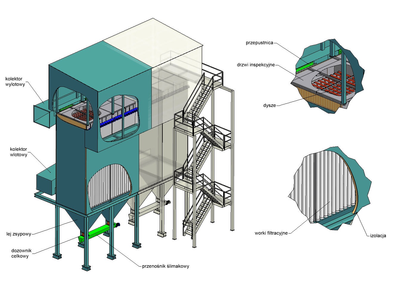 Pionowe filtry workowe ECO - JET przeznaczone są do odpylania gazów z pyłów suchych, we wszystkich gałęziach przemysłu. Filtry te stosowane są najczęściej w procesach charakteryzujących się znaczną ilością oczyszczanych gazów, nawet powyżej 1000000 m3/h.